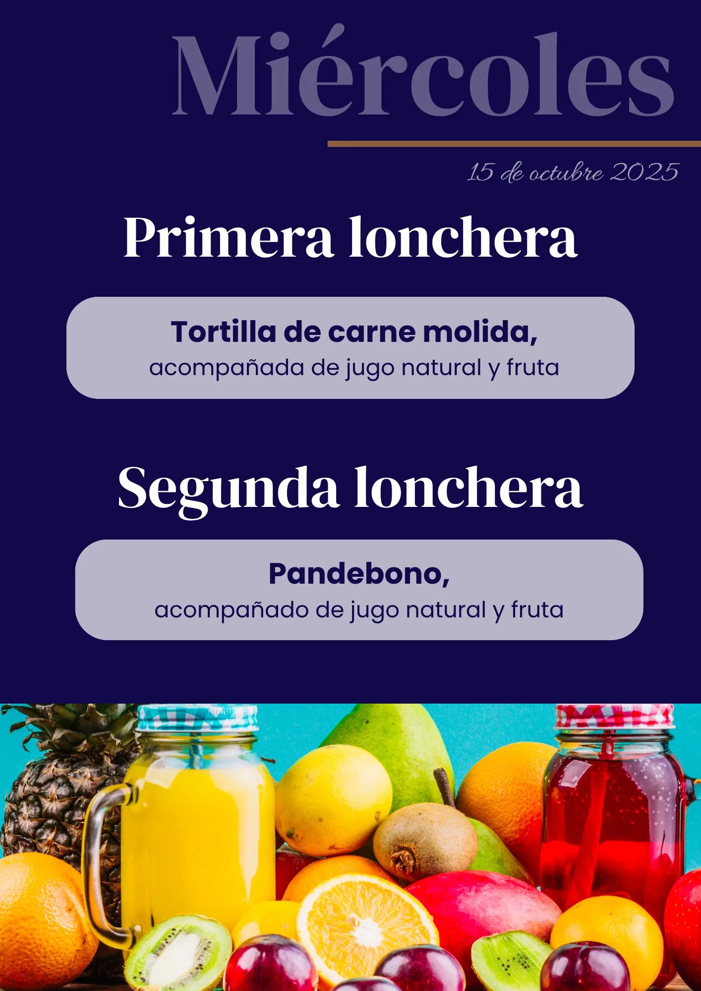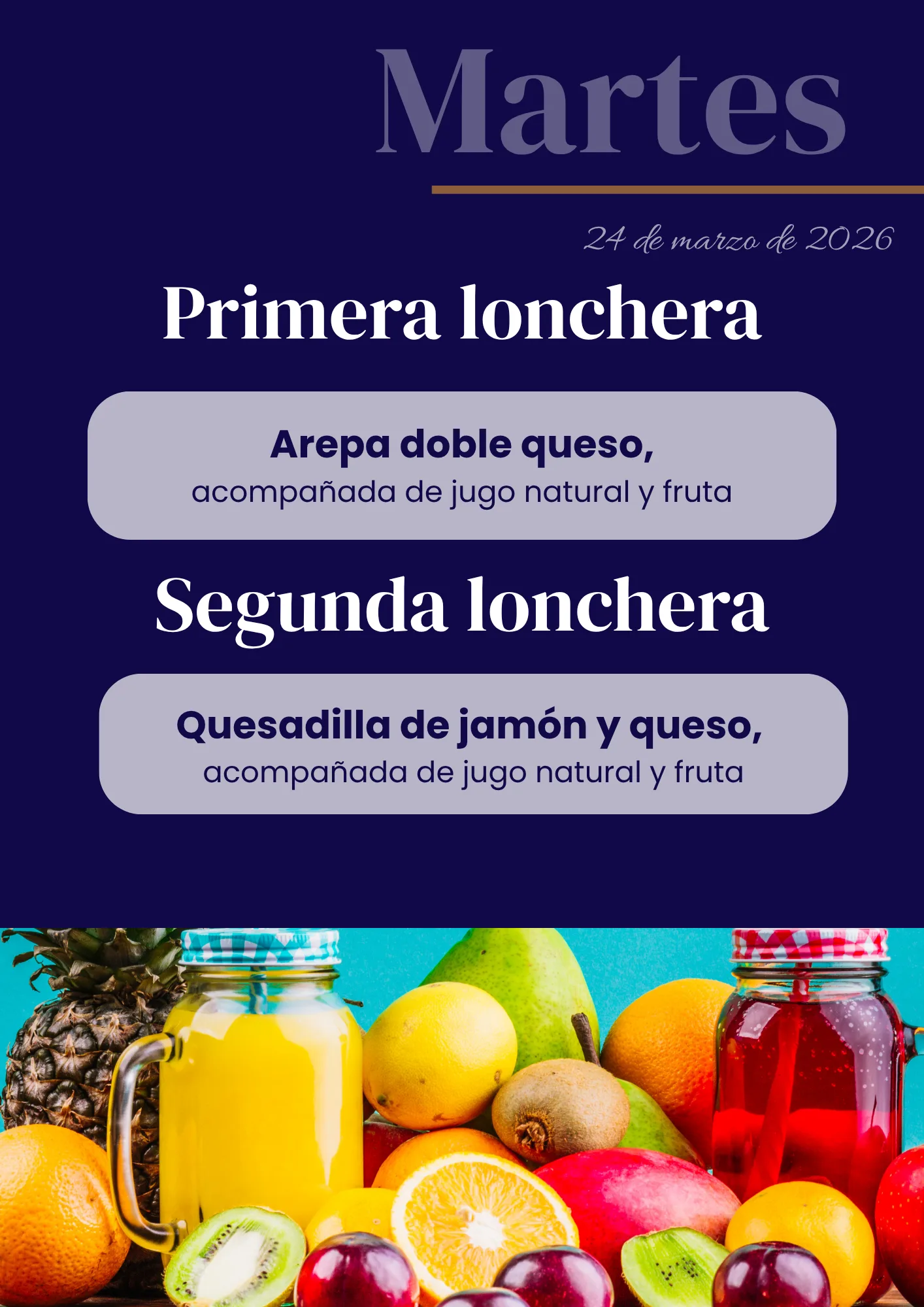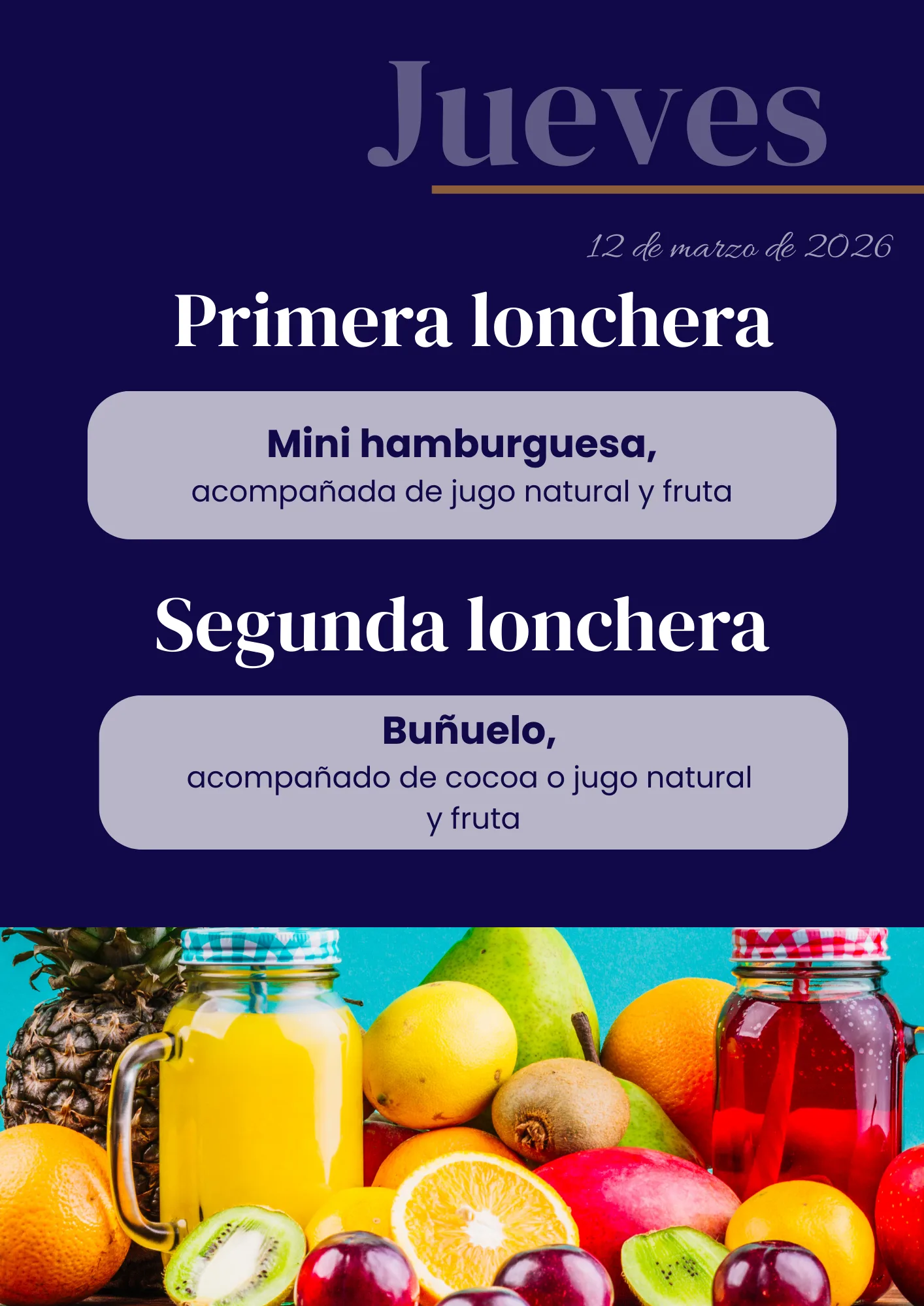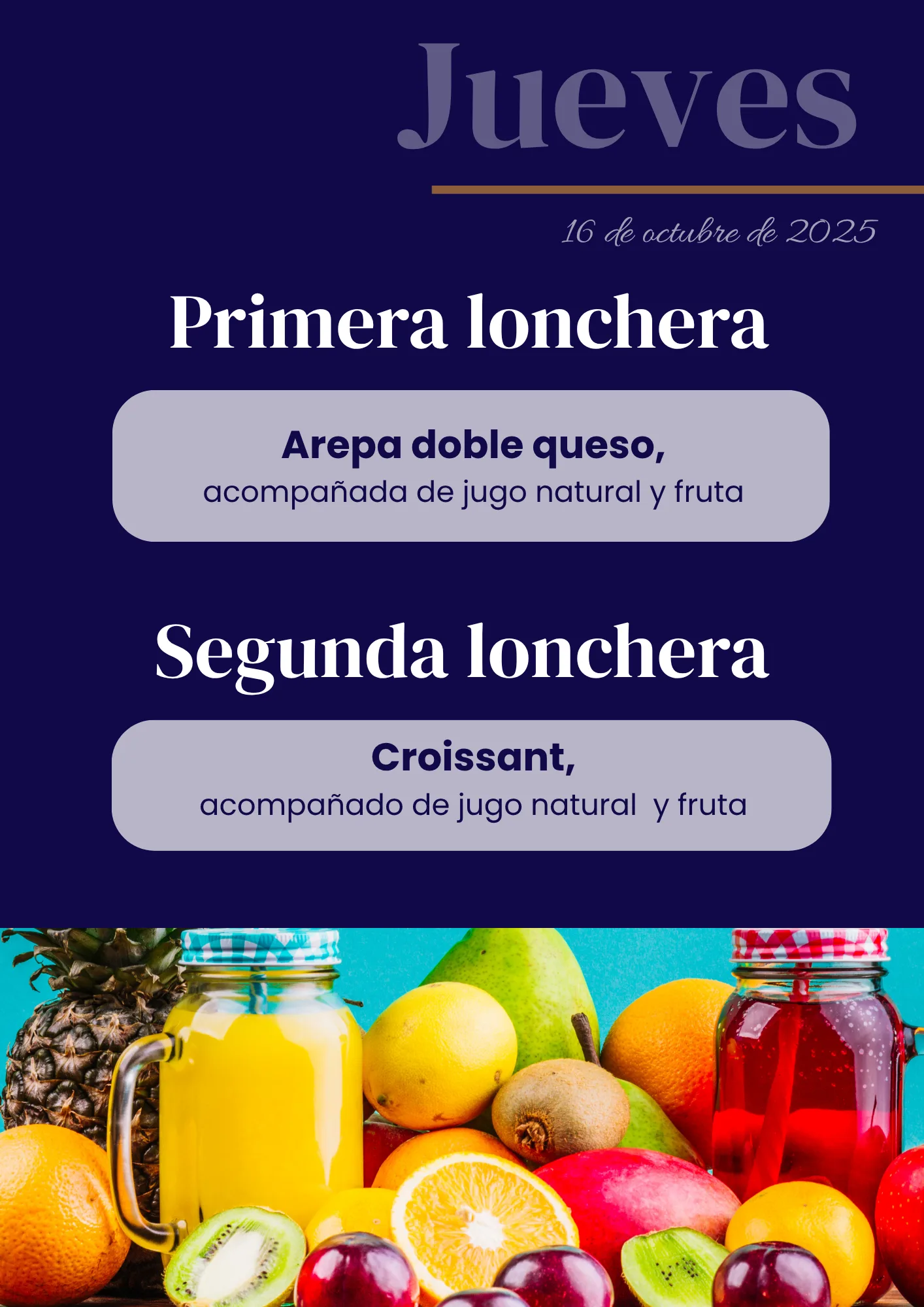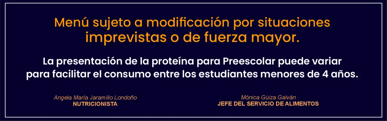 Diseñamos el menú diario de almuerzo y lonchera, teniendo en cuenta las directrices de las Guías Alimentarias Basadas en Alimentos para la Población Colombiana, pero también, las preferencias de nuestros estudiantes, para hacer posible la construcción de platos saludables.
