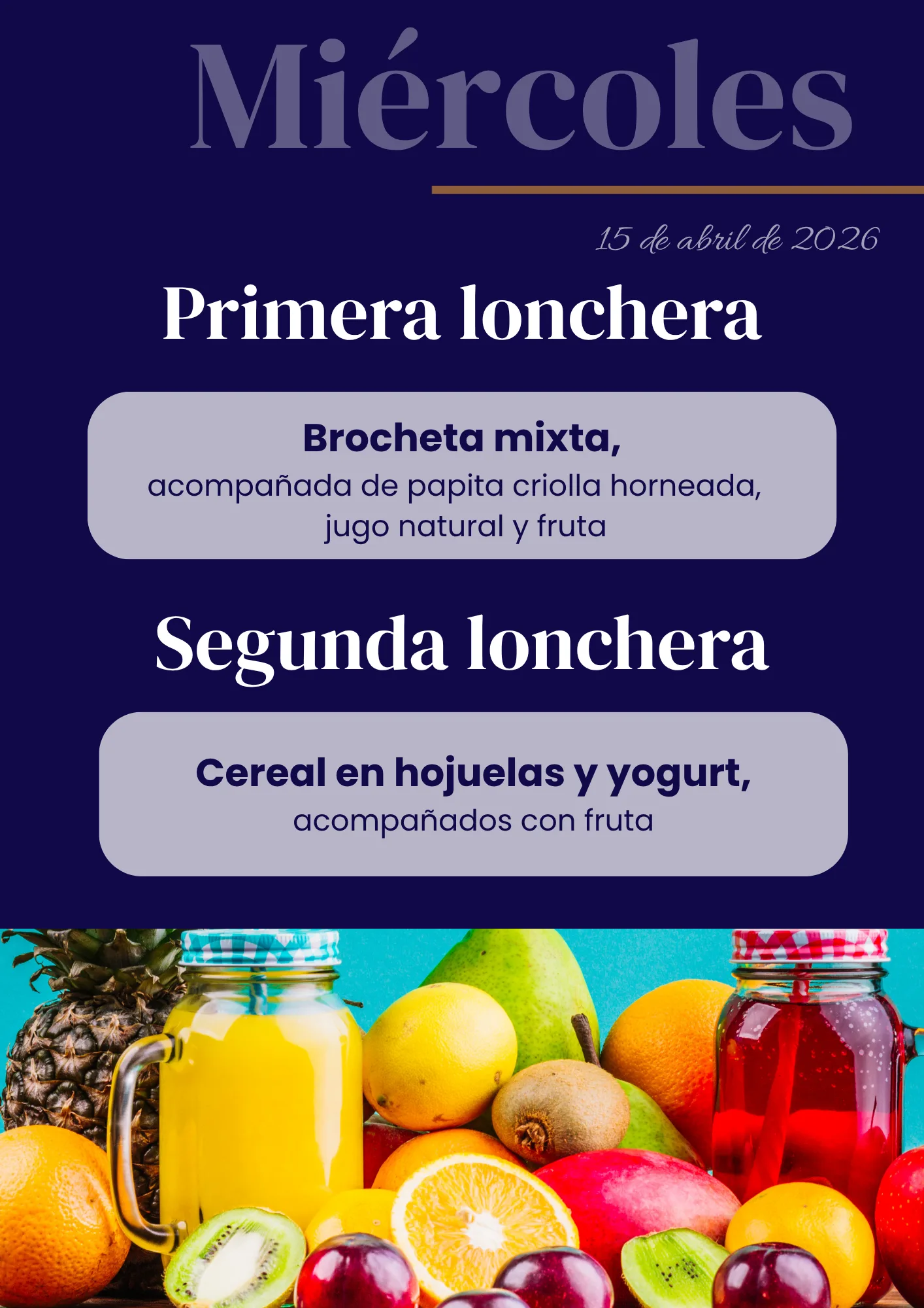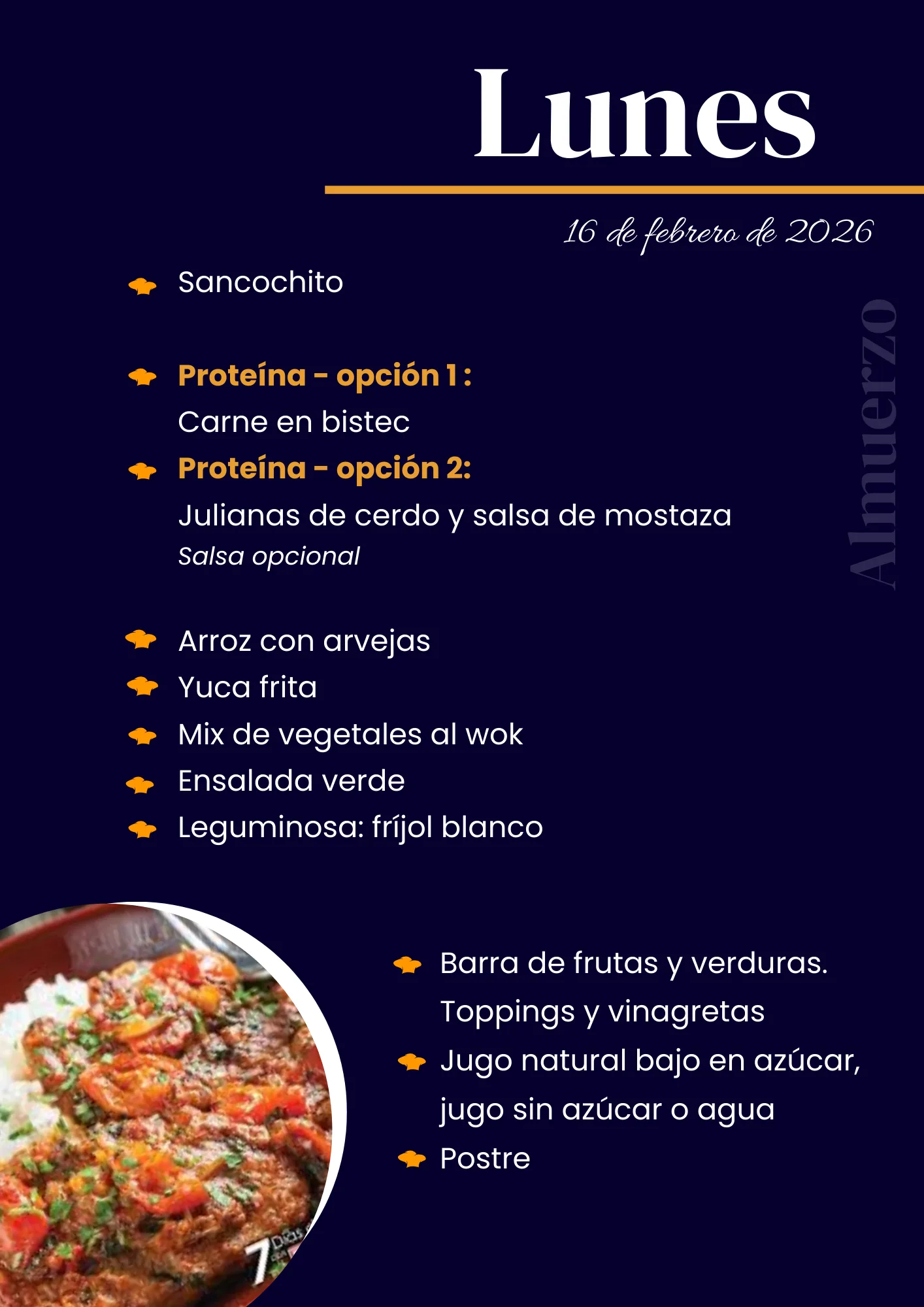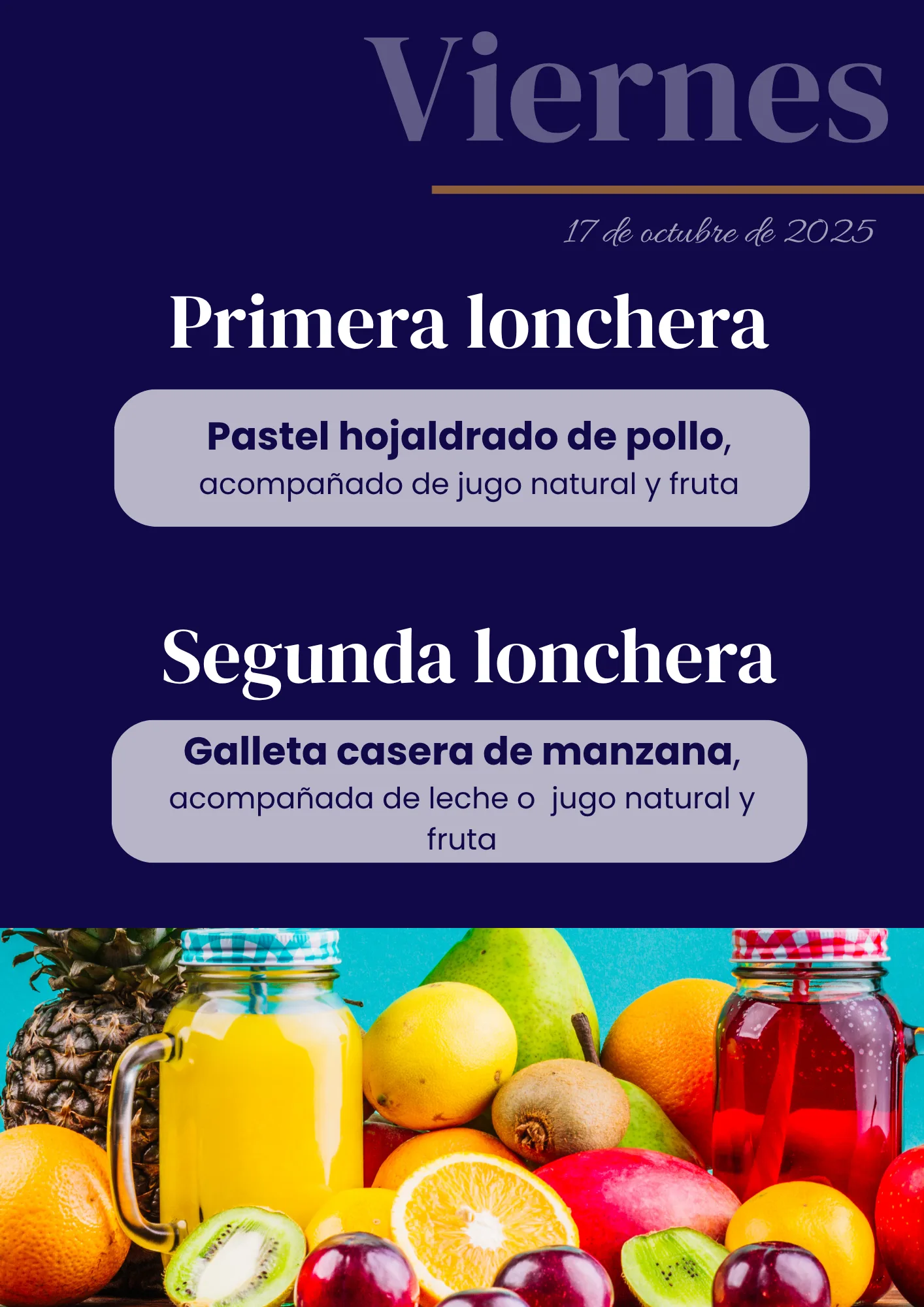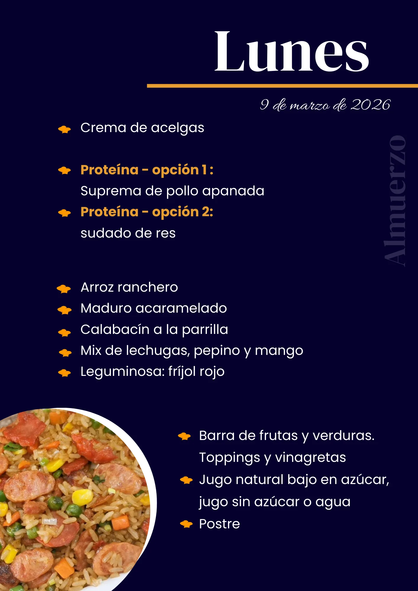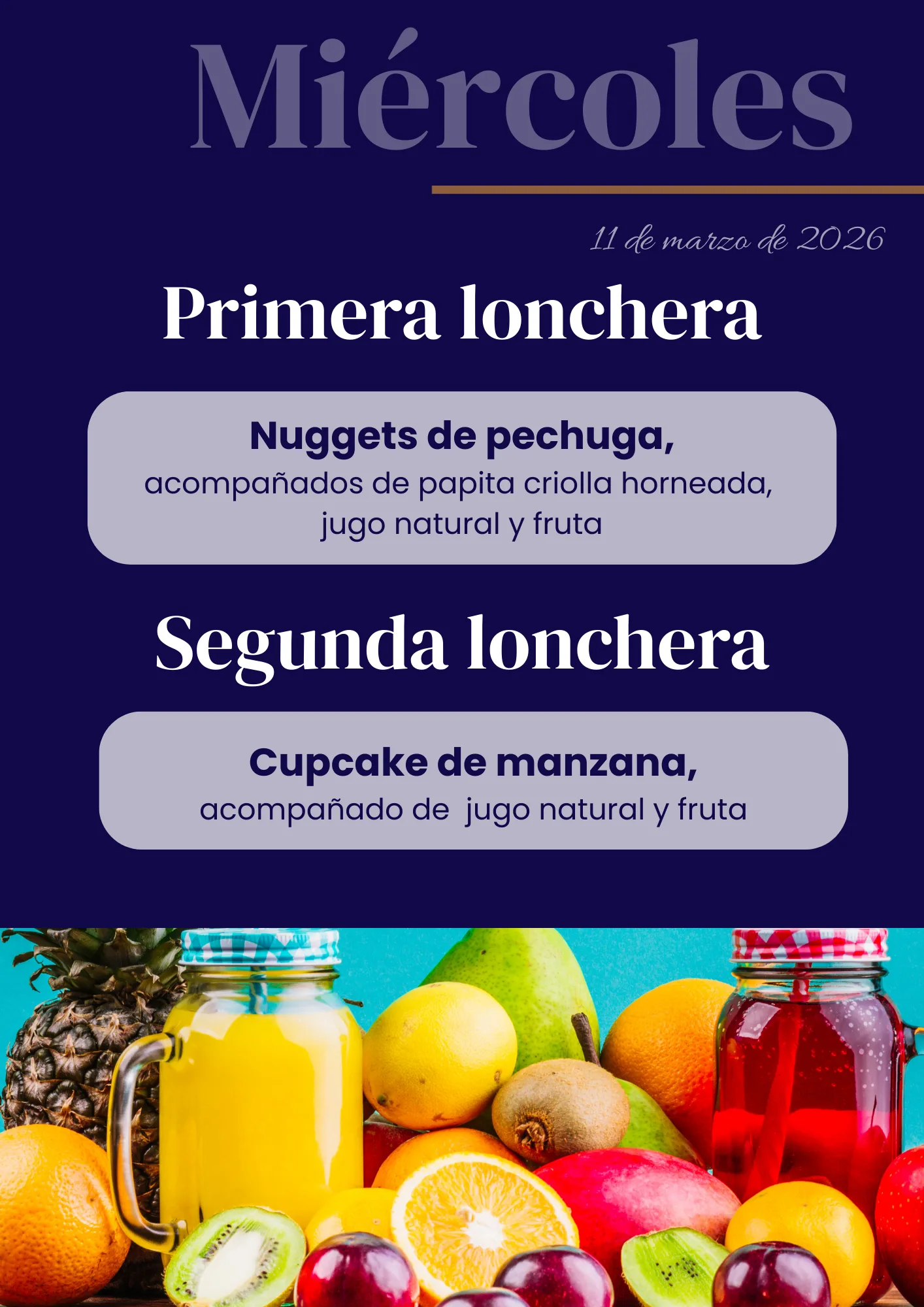 Diseñamos el menú diario de almuerzo y lonchera, teniendo en cuenta las directrices de las Guías Alimentarias Basadas en Alimentos para la Población Colombiana, pero también, las preferencias de nuestros estudiantes, para hacer posible la construcción de platos saludables.