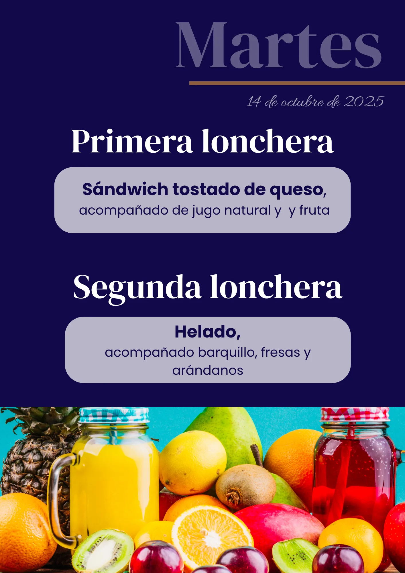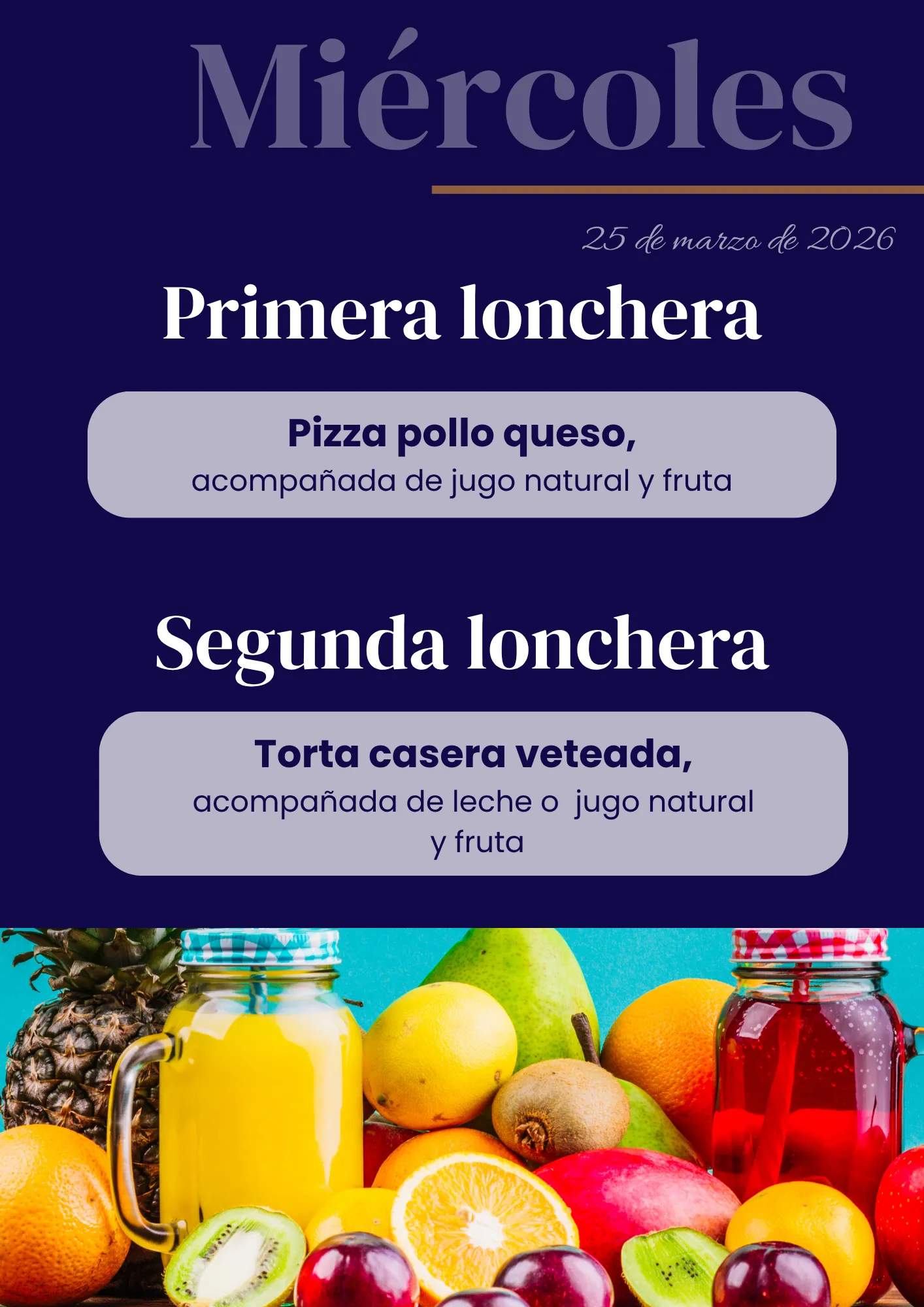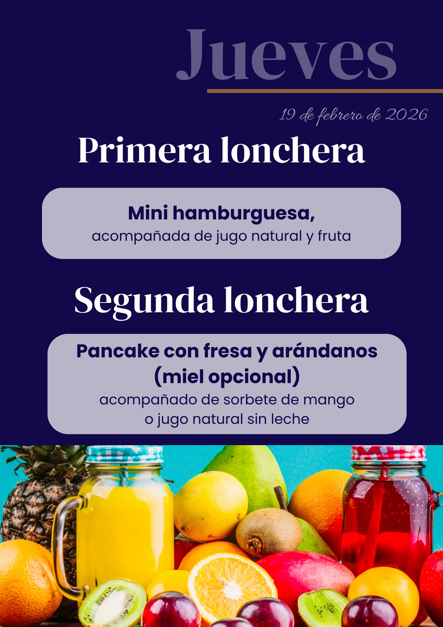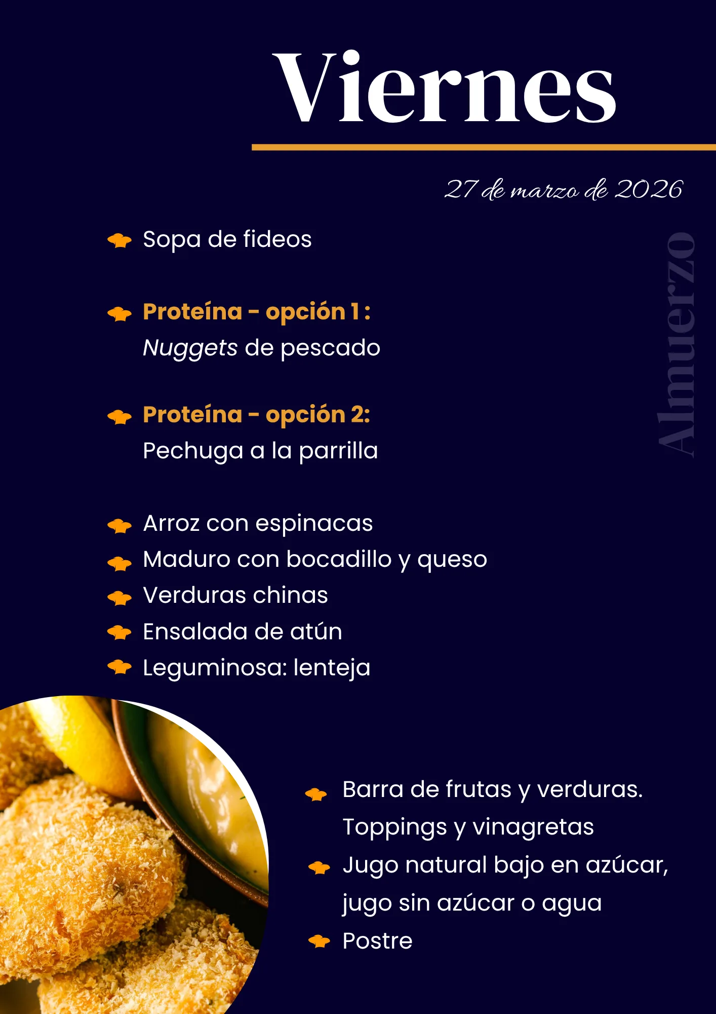 Diseñamos el menú diario de almuerzo y lonchera, teniendo en cuenta las directrices de las Guías Alimentarias Basadas en Alimentos para la Población Colombiana, pero también, las preferencias de nuestros estudiantes, para hacer posible la construcción de platos saludables.