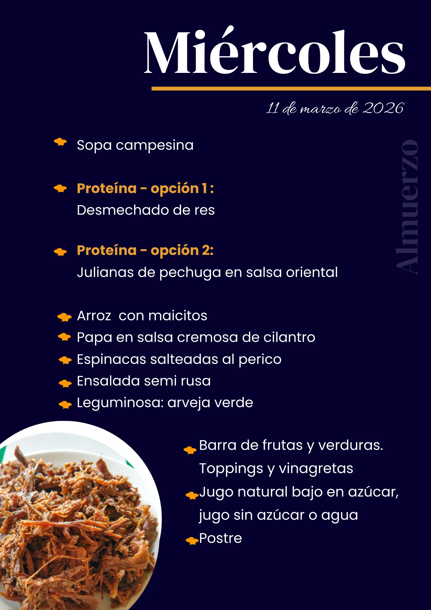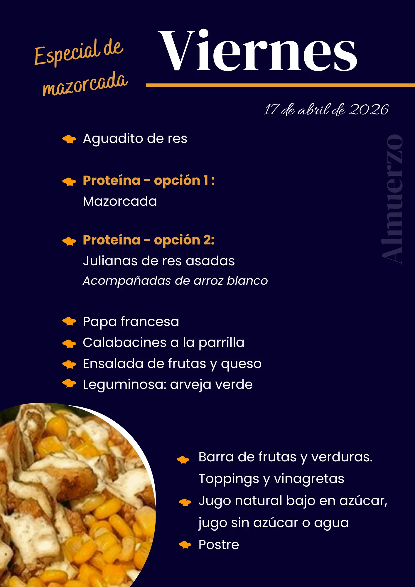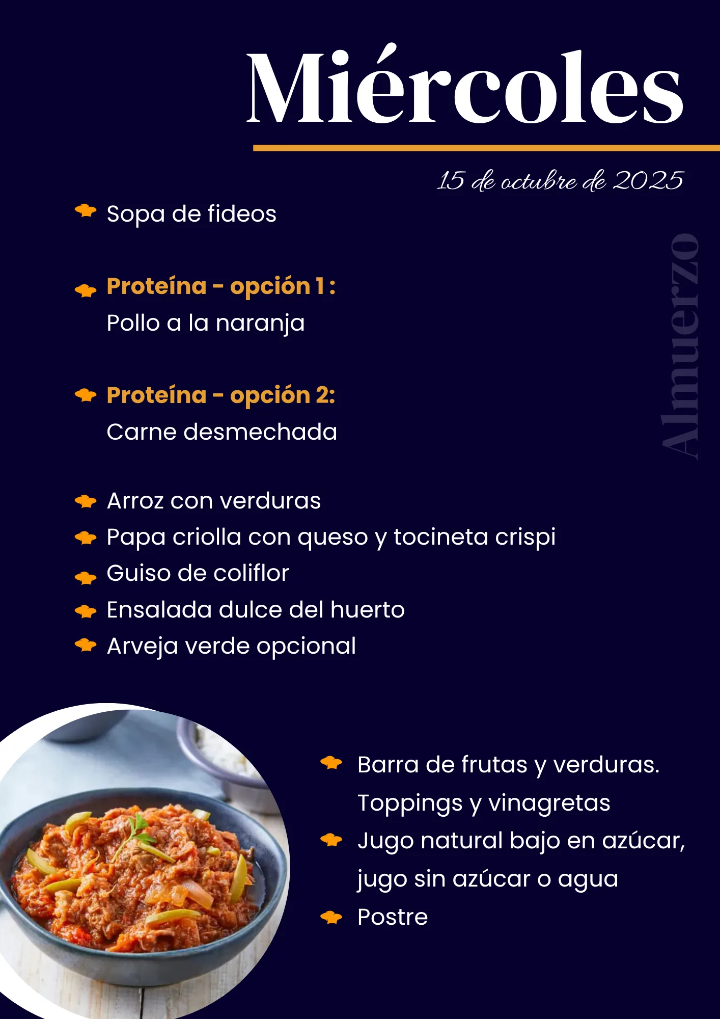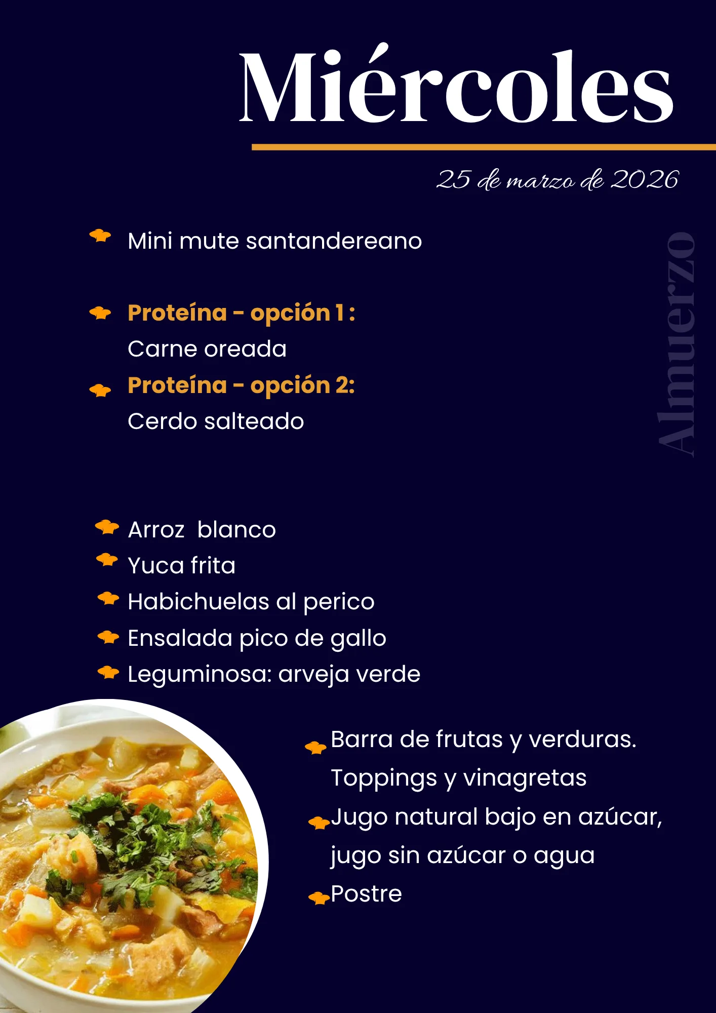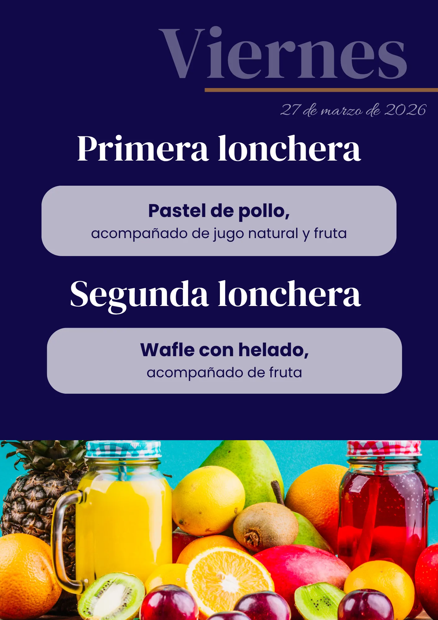 Diseñamos el menú diario de almuerzo y lonchera, teniendo en cuenta las directrices de las Guías Alimentarias Basadas en Alimentos para la Población Colombiana, pero también, las preferencias de nuestros estudiantes, para hacer posible la construcción de platos saludables.
