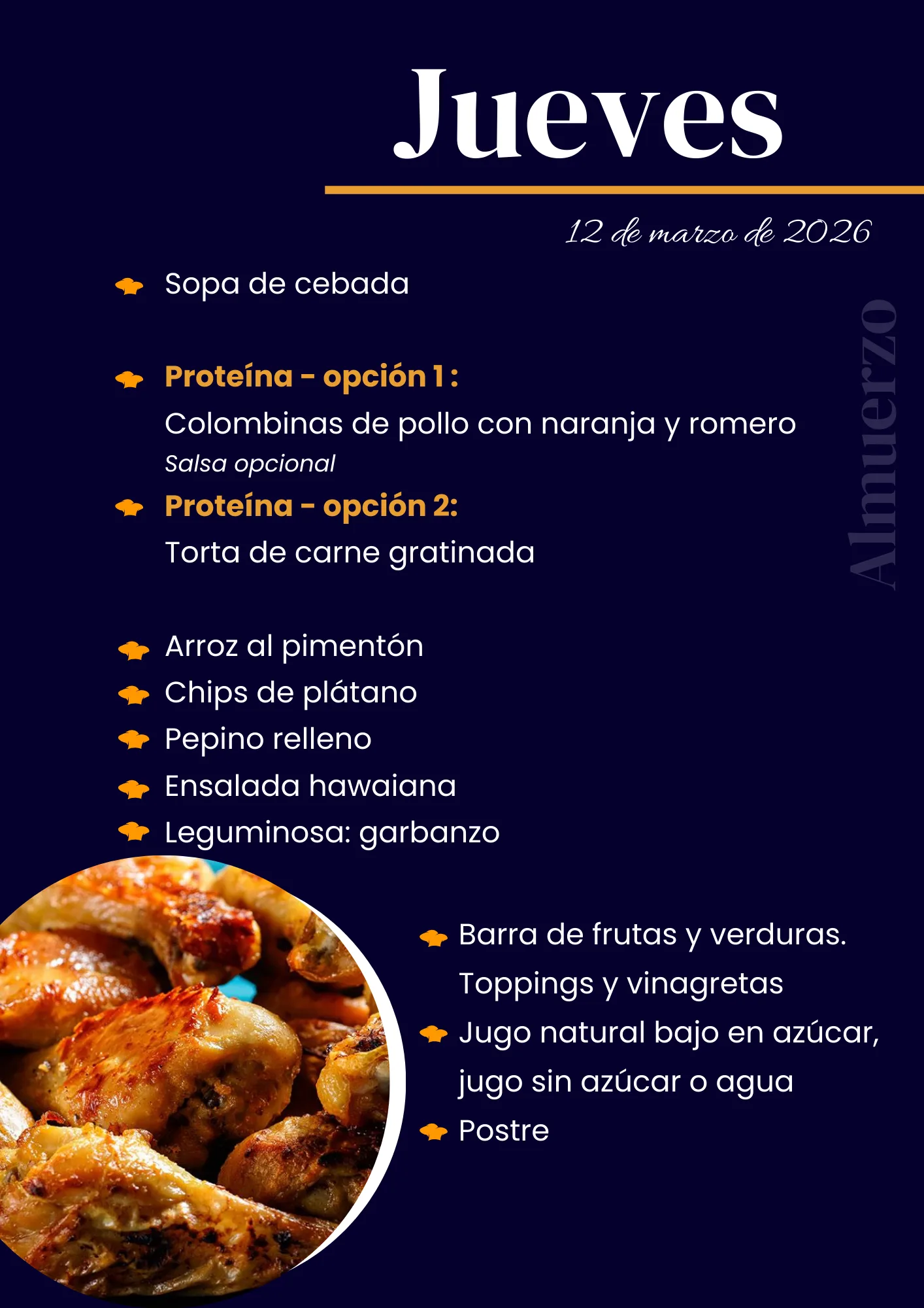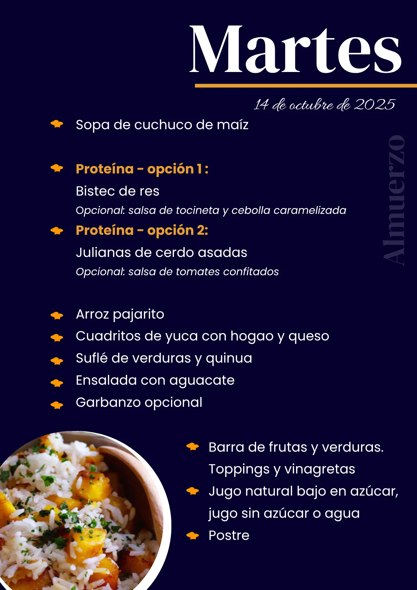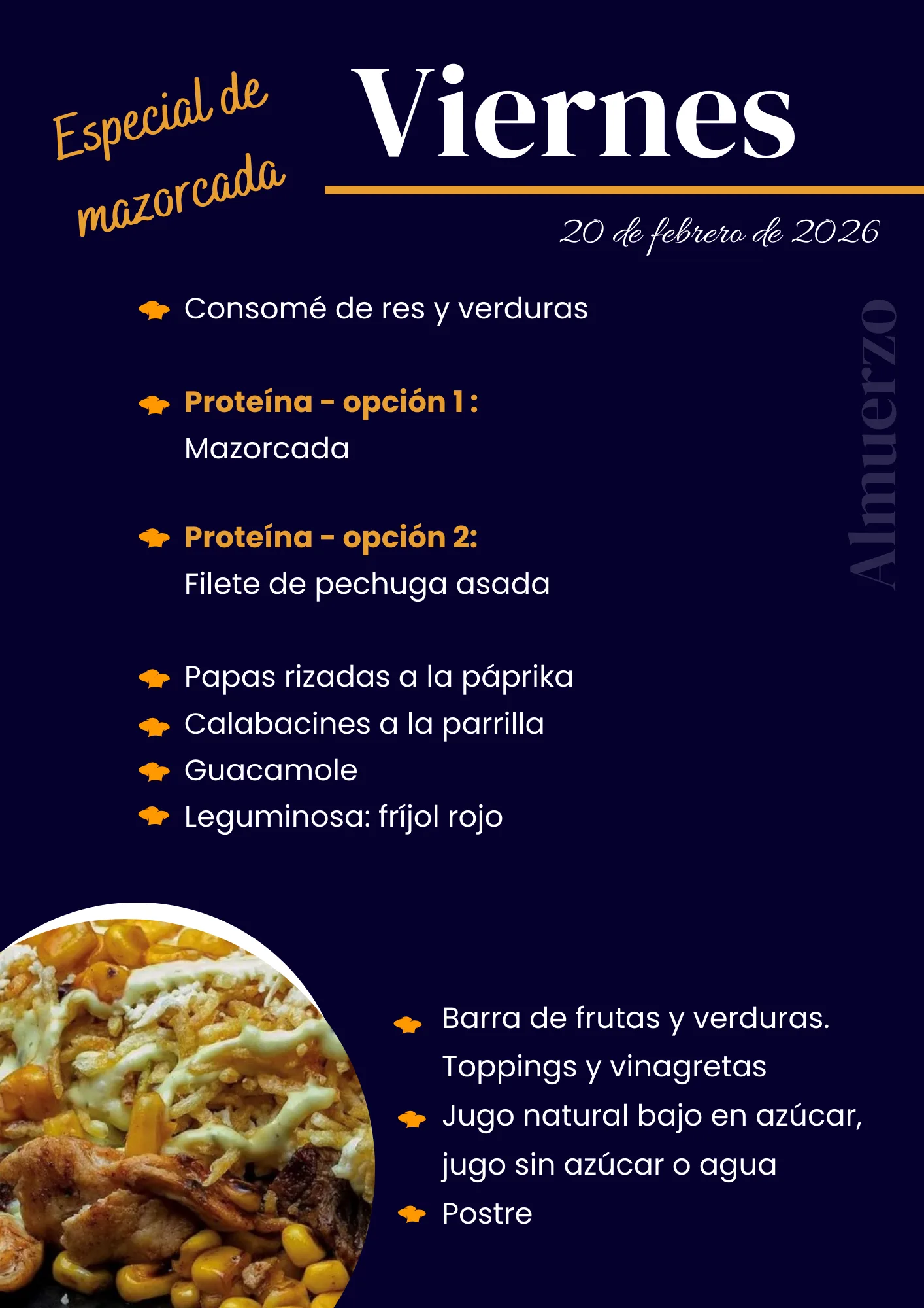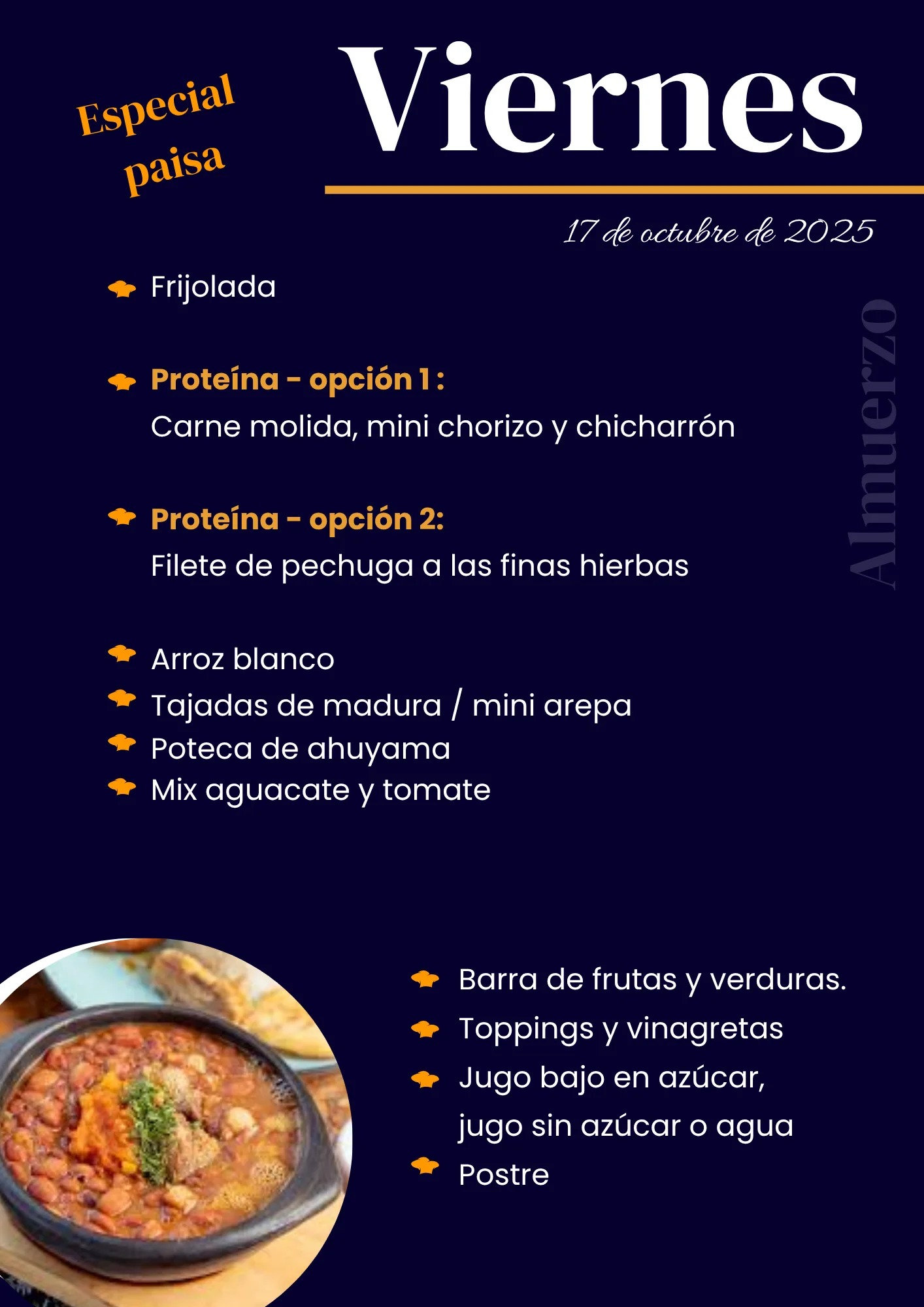 Diseñamos el menú diario de almuerzo y lonchera, teniendo en cuenta las directrices de las Guías Alimentarias Basadas en Alimentos para la Población Colombiana, pero también, las preferencias de nuestros estudiantes, para hacer posible la construcción de platos saludables.