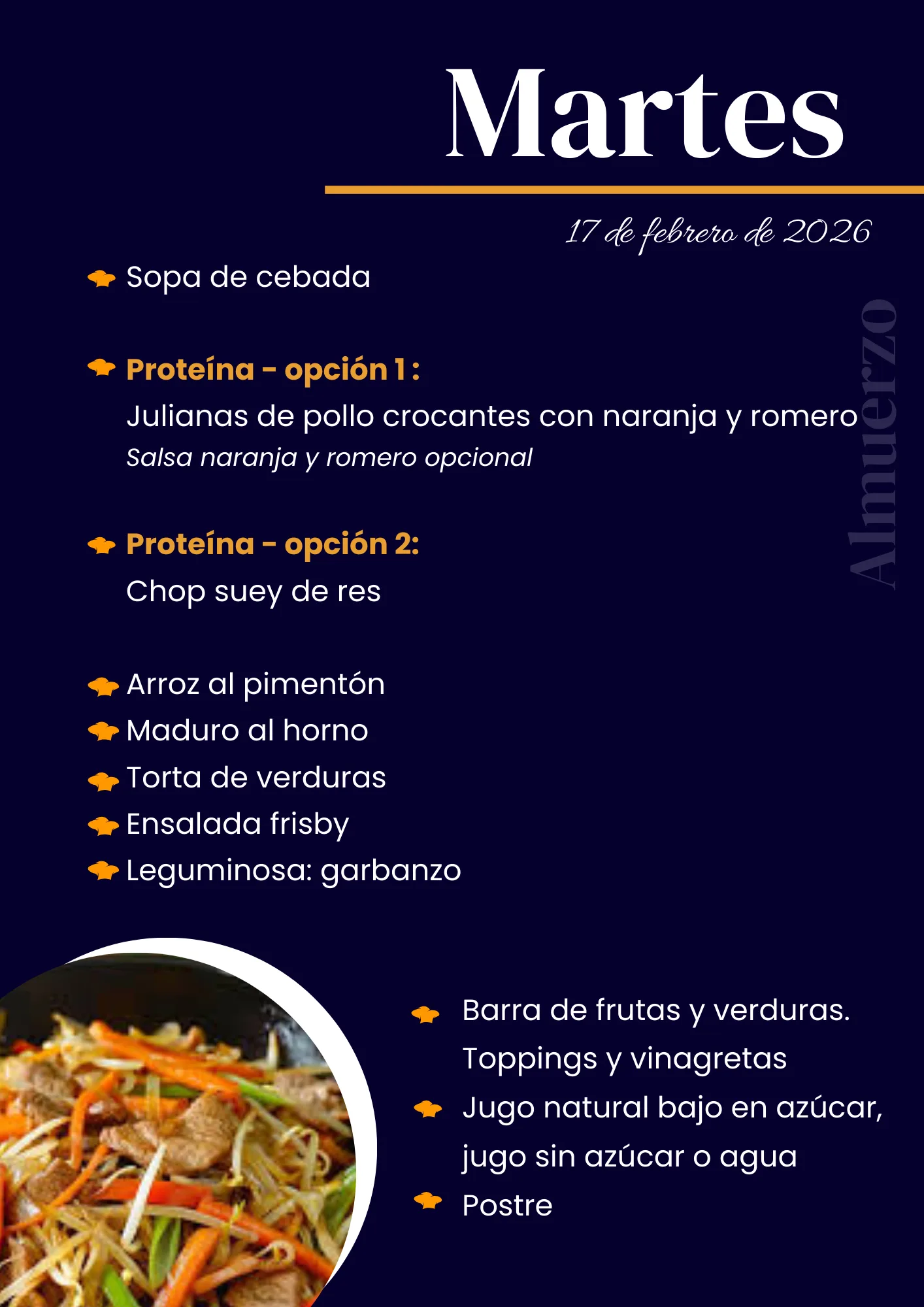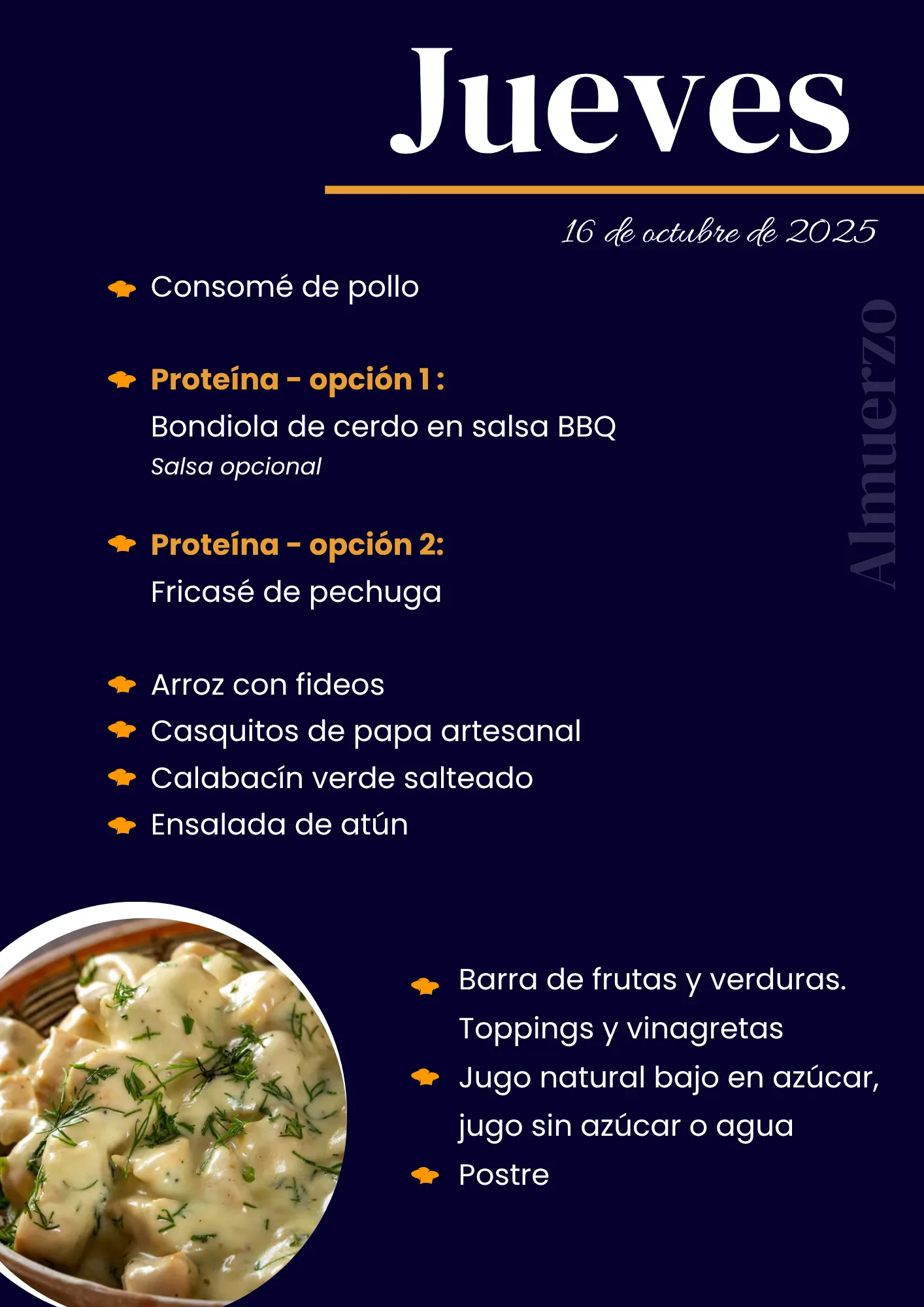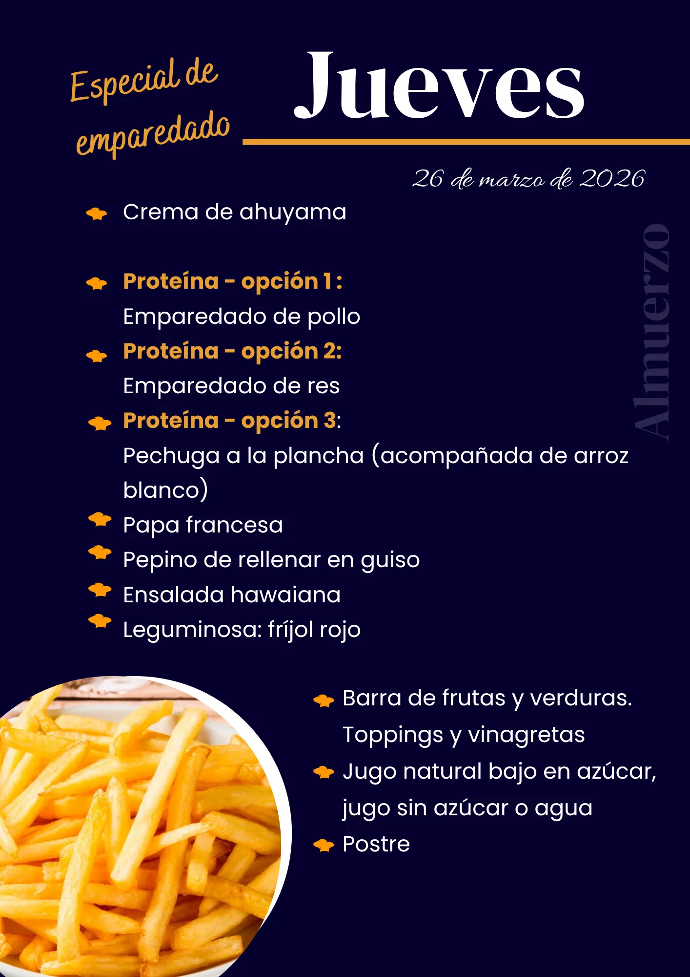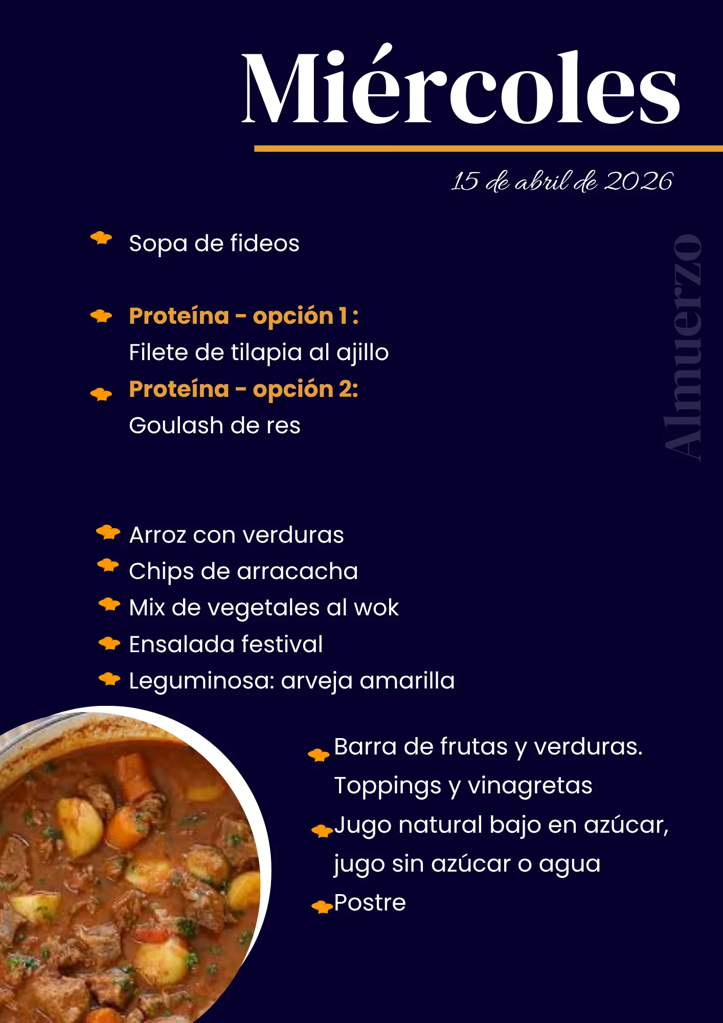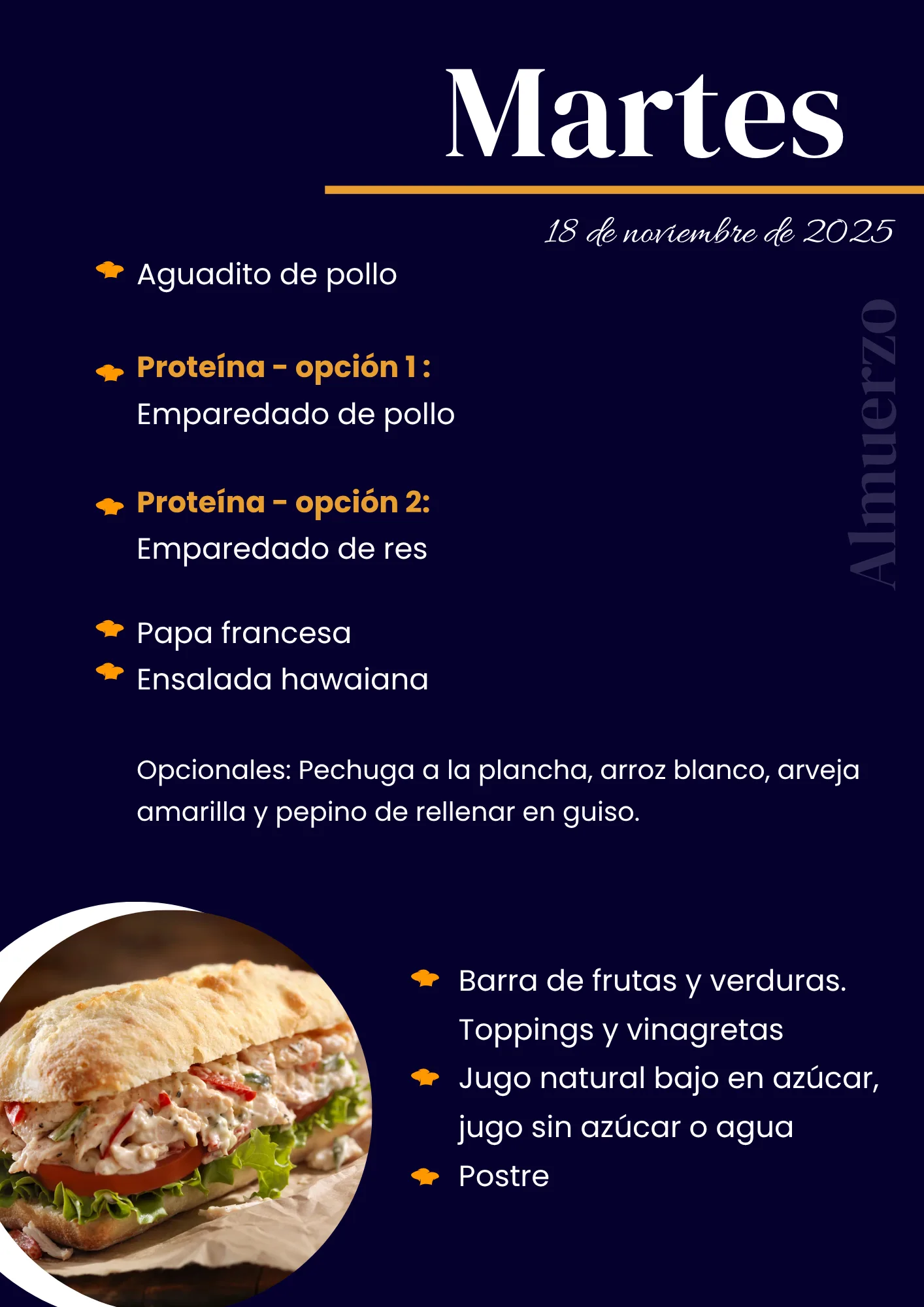 Diseñamos el menú diario de almuerzo y lonchera, teniendo en cuenta las directrices de las Guías Alimentarias Basadas en Alimentos para la Población Colombiana, pero también, las preferencias de nuestros estudiantes, para hacer posible la construcción de platos saludables.