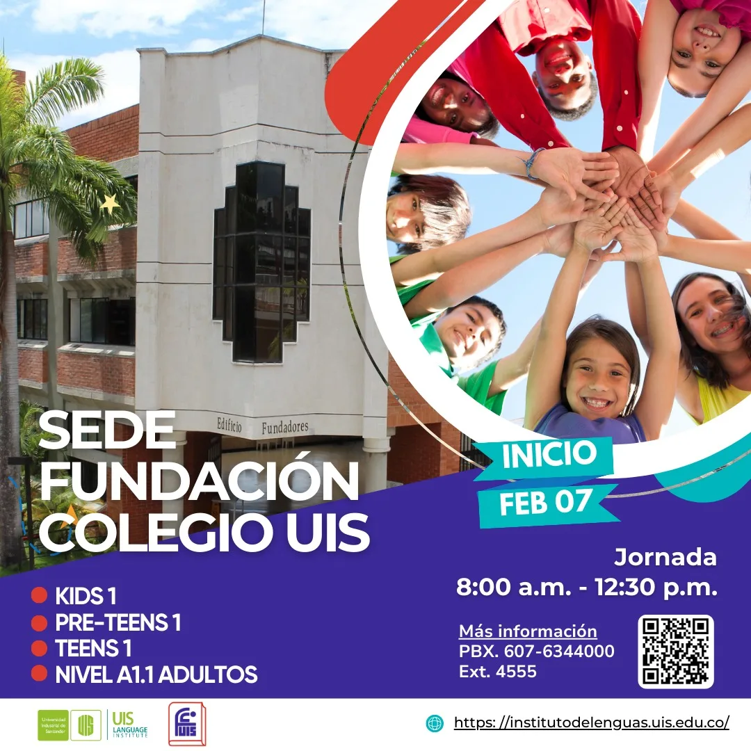 El Instituto de Lenguas de la UIS, presenta su oferta de servicios para el programa de inglés de niños y jóvenes (7 años en adelante). Los cursos se ofrecerán de manera presencial en las instalaciones de Fundación Colegio UIS.